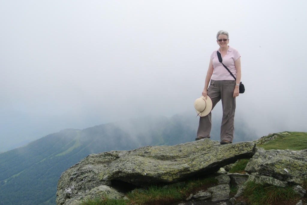 On our second day, we went up Mount Mansfield (4395 ft). Oh, ok, this is another one you can drive most of the way along a road which doubles as a ski run in winter. However, it was still a mile and a half from the parking lot to the summit, and although the height gained was a puny 600 feet it was very rocky and quite a scramble. I look pleased to have arrived.