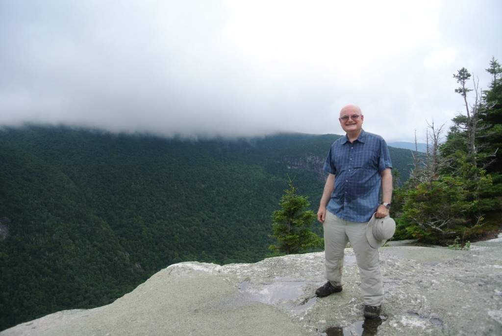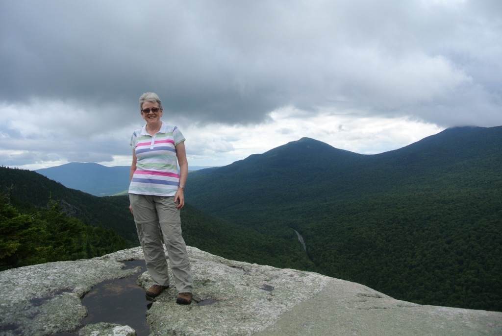 But not much. We woke to a beautiful day in Bethel, so set off for Grafton Notch again to do some of the hiking that we had deemed it too wet for the previous day. As we drove upwards, the clouds grew thicker and when we got out at the trailhead it was raining lightly. We had decided to climb 900 feet to Table Rock to start with – this hike has two choices, a steep route and a more moderate path, so you can make it a loop walk. We chose to go up the steep route (because I feel safer climbing than descending) which was described in the information leaflet we had as “boulder strewn”. It certainly was. What the leaflet didn’t mention was that you had to climb over many very large boulders and scramble between them. Rock climbing if you ask me – occasionally, I needed a helping hand to pull me up and, once, a firm shove from behind. I was particularly despondent when we met two young men coming down who told us that the route got more challenging ahead, and I almost decided to turn back. Fortunately we didn’t because they were wrong – we were over the worst and the views from the top were lovely, despite the low cloud. Here we are enjoying our triumph.