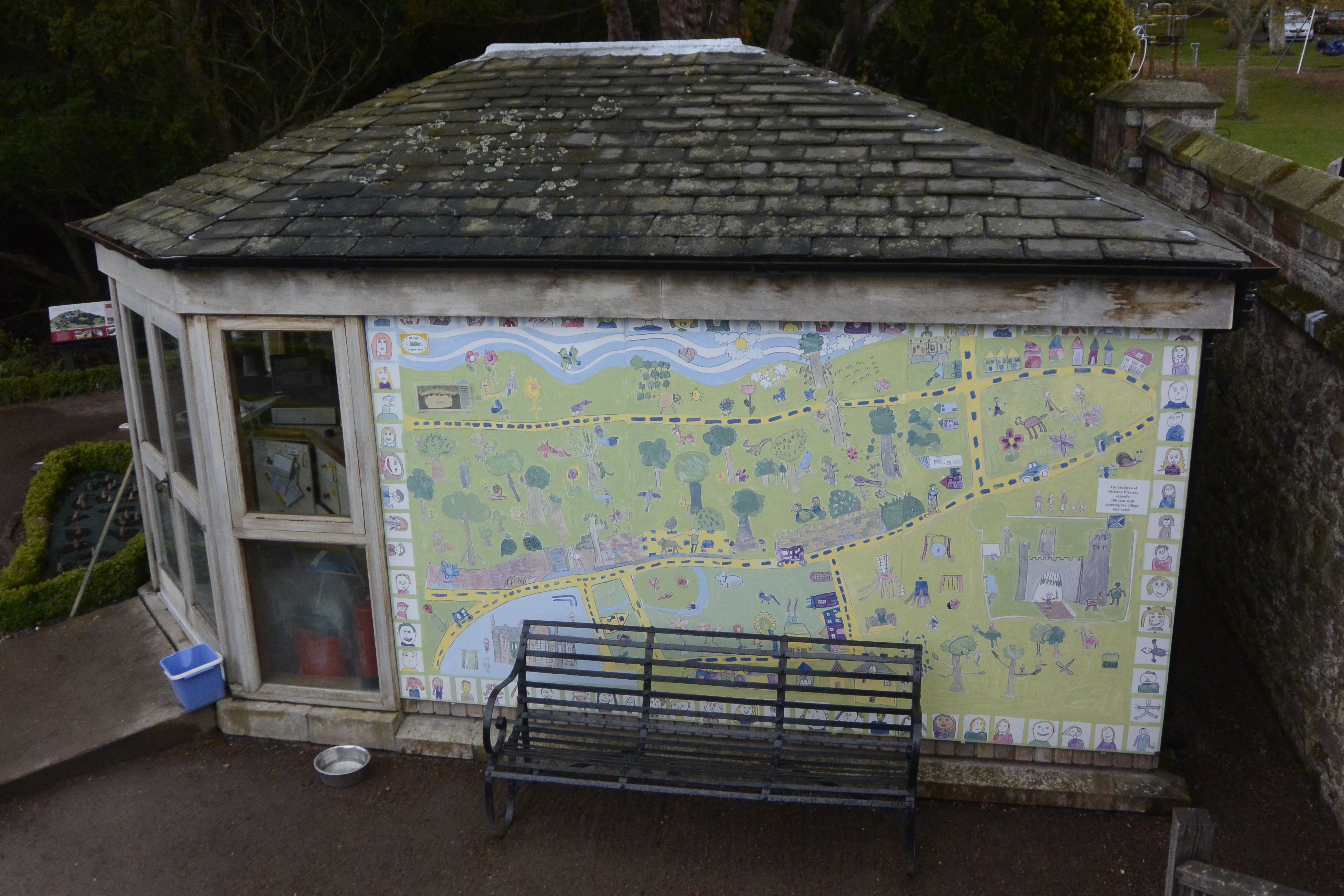 The photograph below wasn’t taken for the bench at all, but for the mural behind it. That’s the wall of the ticket office at Dirleton Castle – if you zoom in, you can read the notice at the right hand side: