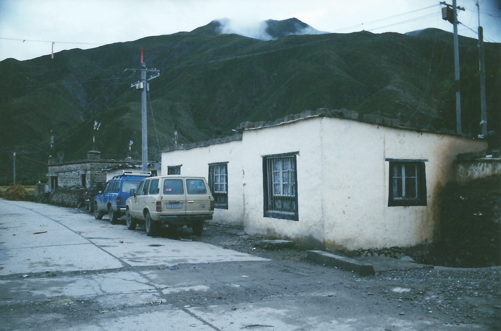 The other vehicles backed up and prepared to spend the night. W was more resourceful. He knew of several places we might be able to sleep: the road menders’ hostel, the hydro-electric power station hostel and an army hotel. The first two were closed and the last would not (understandably) let us in. By this time we had reached a small village with a teahouse and, after some negotiation, we were invited in for tea with the possibility of using the place to bunk down for the night. It was filthy, buzzing with flies and the roof leaked. We accepted the tea (which was fine, untainted by yak) but declined the offer of accommodation, preferring to sleep in the Landcruisers. W and the drivers said they would use the teahouse, but a young, single woman ran it and she didn’t want to share it with three strange men. W then reported that the farmers had offered us the use of their bedrooms and I asked if they would be clean. No, he said worse than this. We declined again and all six of us elected to sleep in the vehicles, so W and the drivers went to the farmers’ houses.