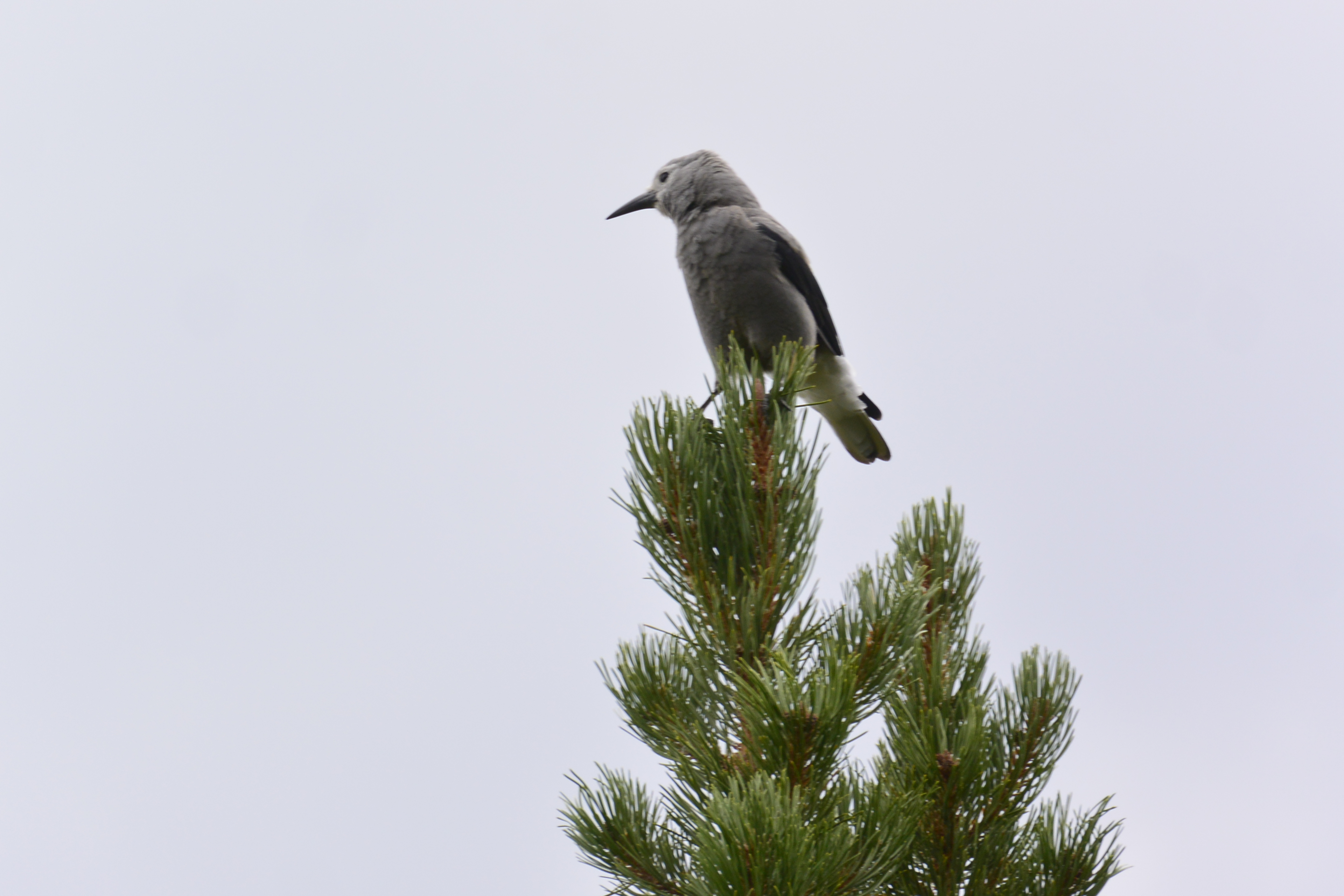 I believe this is a Clark’s Nutcracker. The following information is from All About Birds, the Cornell Lab of Ornithology: “High in the mountains of the West, gray-and-black Clark’s Nutcrackers swoop among wizened pine trees, flashing white in the tail and wing. They use their dagger-like bills to rip into pine cones and pull out large seeds, which they stash in a pouch under their tongue and then carry away to bury for the winter. Each birds buries tens of thousands of seeds each summer and remembers the locations of most of them. Seeds they don’t retrieve play a crucial role in growing new pine forests.”