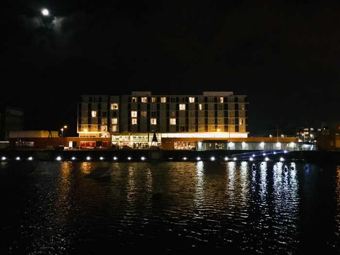 I chose the Apex Hotel because, although I have never stayed overnight in Dundee before, I had visited it a couple of times for conferences and knew it was good. The location, right on the waterfront, is excellent and only a short walk from the V&A. It’s not the most exciting of buildings, but the surroundings were attractive at night (see top of post). Berthed nearby is HMS Unicorn, launched by the Royal Navy in 1824 and now the world’s last intact warship from the days of sail. We’d like to have visited, but just didn’t have time.