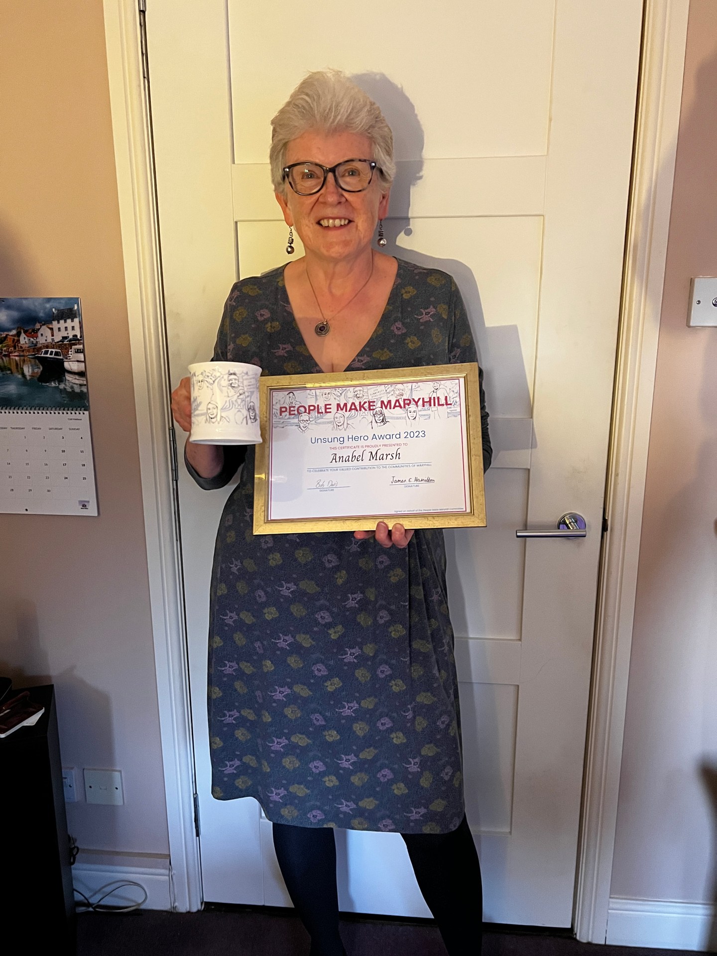 Home with my certificate and commemorative mug.