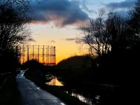 Sun setting behind the gas holders