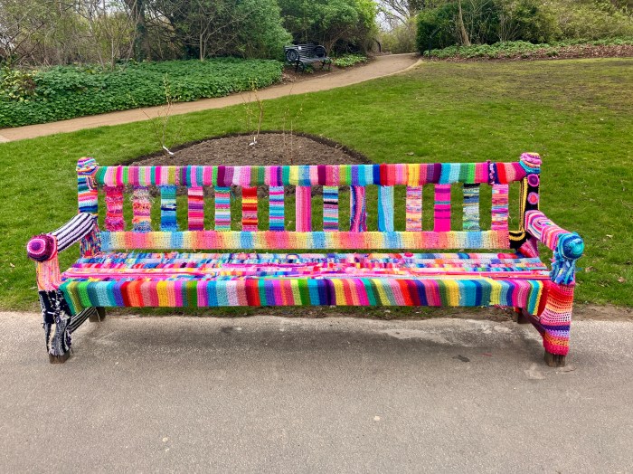 A bench for Jude – every Spring one of artist Rita McGurn’s daughters yarn bombs this bench in the Botanic Gardens in her memory.