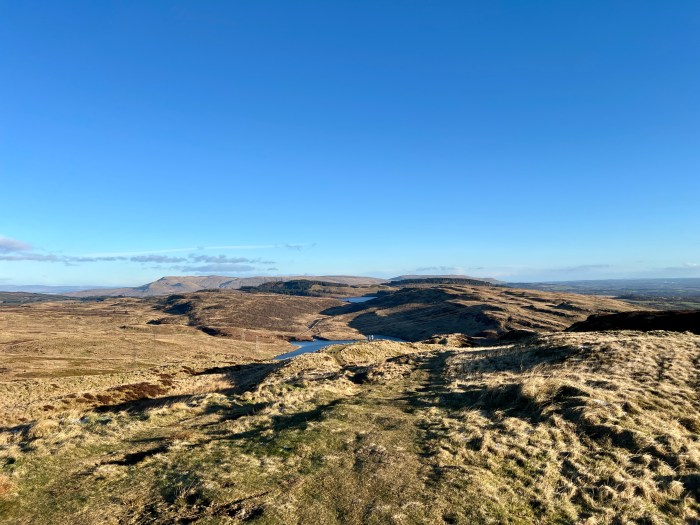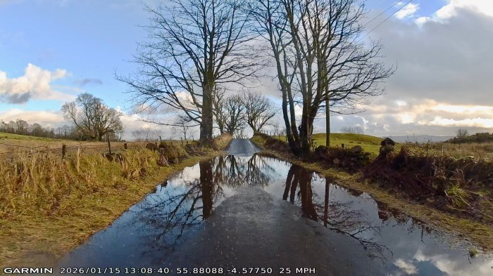 Finally, the January weather wasn’t always great for cycling, but I’ve selected my two favourite sunny images from John’s collection. Can you spot the hikers near the centre of the first one? And I’ve left the Garmin info on the second one, chosen for its reflections, so you can see how fast he was riding into that puddle.