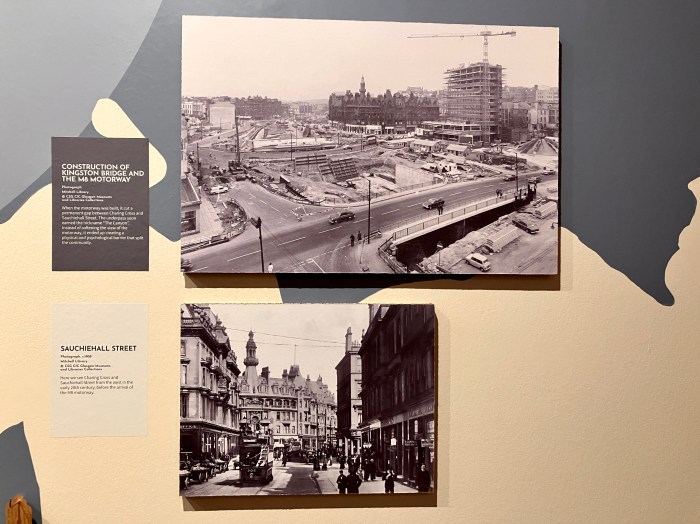 As for community destruction, nothing encapsulates that better than the two images in the photo below showing Charing Cross at the beginning of the 20th century and while the M8 urban motorway (opened 1972) was under construction. You can orient yourself with the fancy roof of Charing Cross Mansions which appears in both photographs and still exists today – as does the M8. Many communities were displaced to create it and it remains, as foretold at the time, a scar that will never heal.